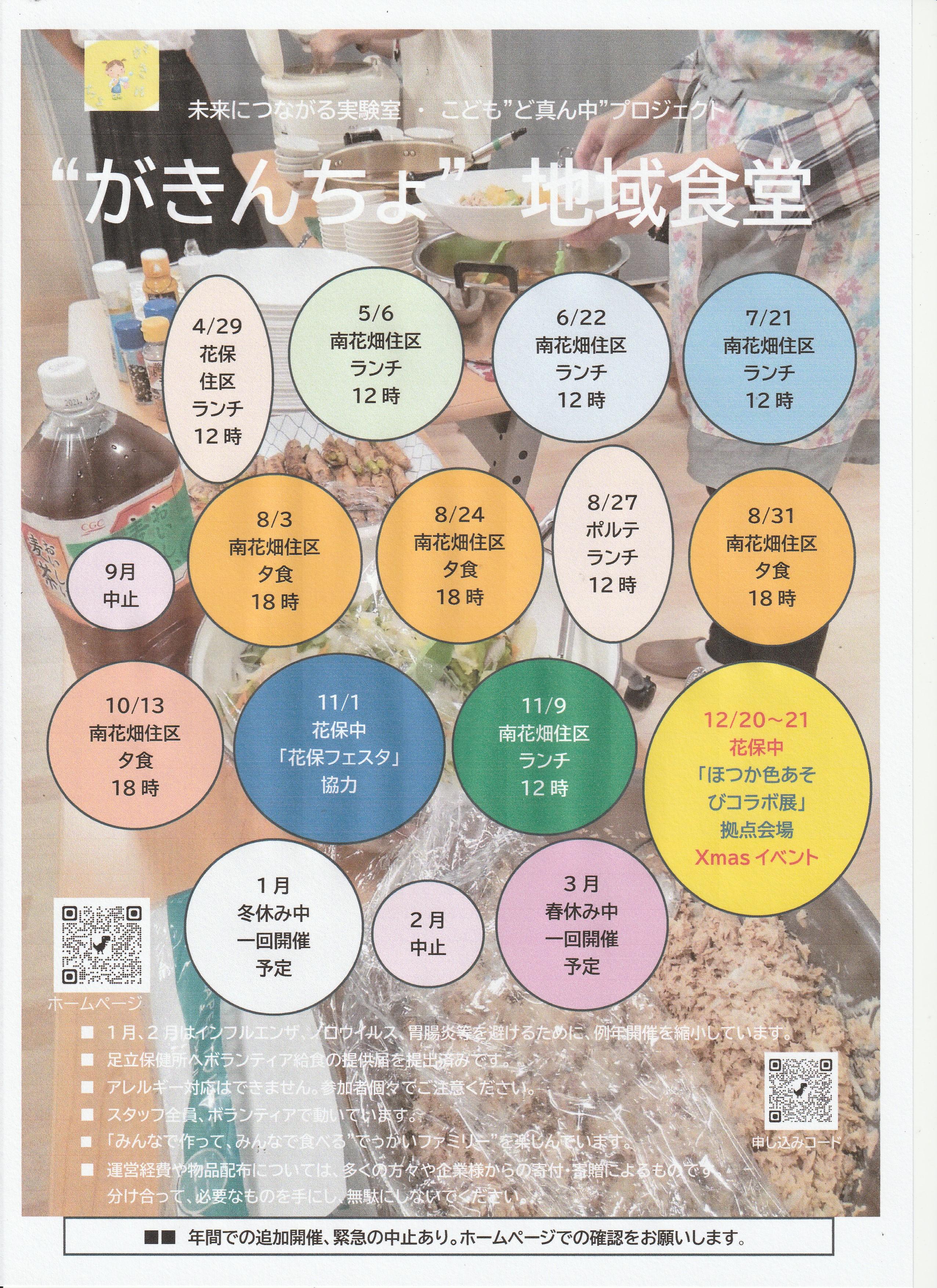 令和7年度 "がきんちょ"地域食堂開催予定 4月29日(祝日)12時~花保住区センター
