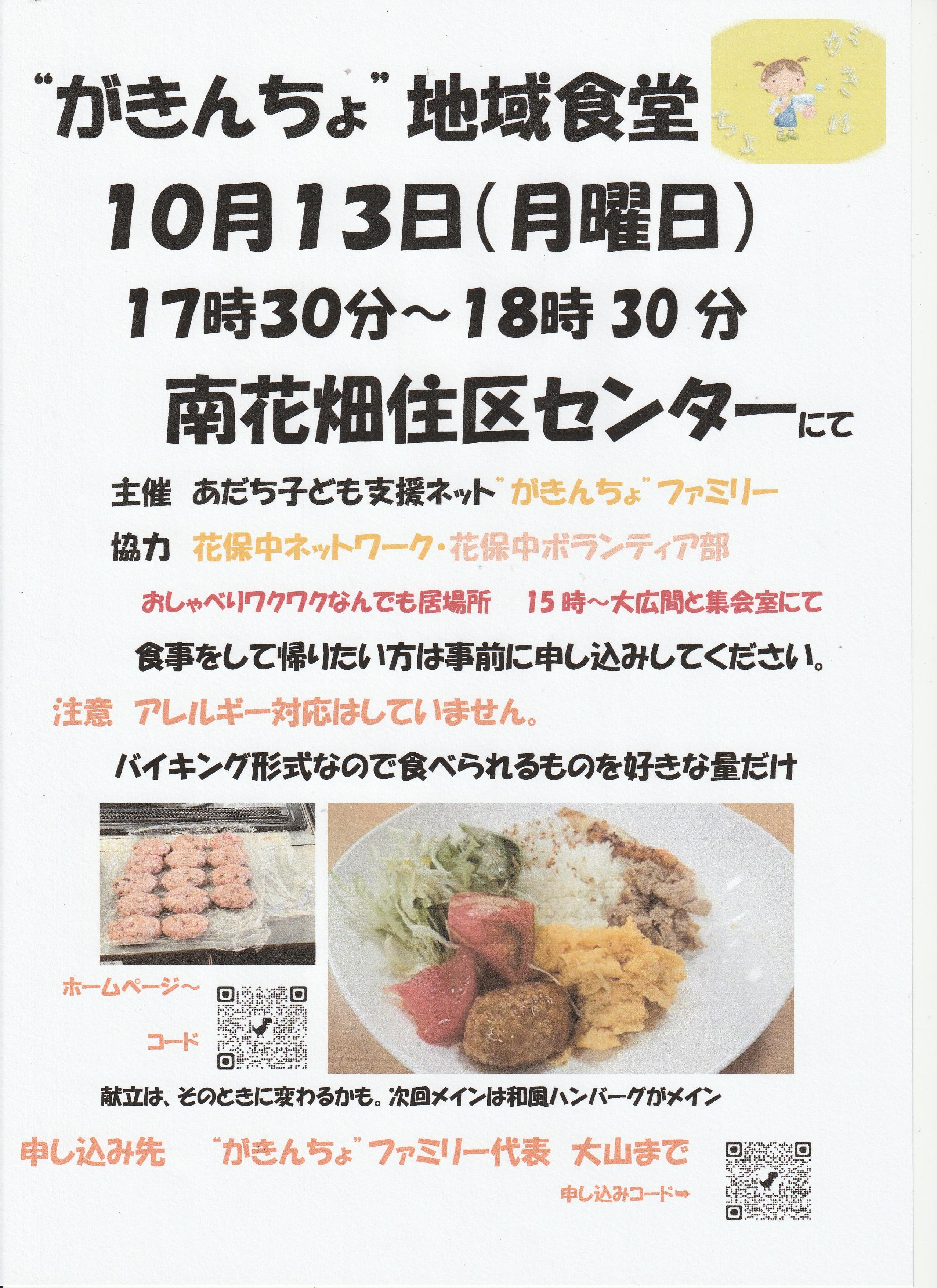 次回開催 10月 13日(月曜日) 地域食堂 17時30分~18時30分